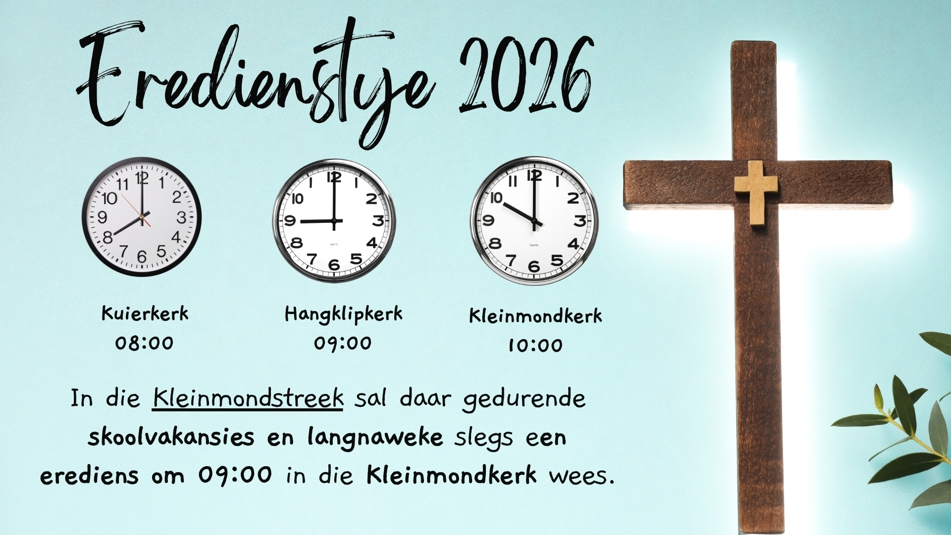 09:00 Hangklipkerk 11:30 gerimed 16:30 Kleinmondkerk